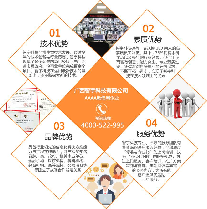 廣西智宇科技有限公司,自1995年成立以來(lái),已發(fā)展成為一家高新技術(shù)企業(yè),擁有多家分公司,遍布南寧、桂林、玉林、河池、扶綏、百色、欽州、防城港等地。憑借30年的專業(yè)經(jīng)驗(yàn)和技術(shù)儲(chǔ)備,智宇科技已成為一家行業(yè)領(lǐng)先的集團(tuán)企業(yè),致力于運(yùn)用前沿科技產(chǎn)品和技術(shù),為客戶提供高效服務(wù)。